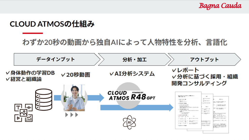 2026年3月より、「20秒の動画」から人物特性を分析する独自AIシステムをつかった経営支援コンサルティングサービス、「CLOUD ATMOS(クラウド・アトモス)」のベータ版を開始しました。